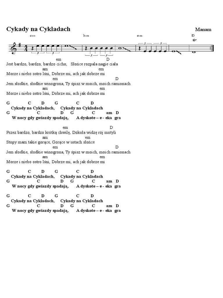 Cykady Na Cykladach Maanam Chwyty Bicie Tekst Tabulatura from lh3.googleusercontent.com Przez bardzo bardzo krótką chwilę dokoła widzę rój motyli stopy mam takie gorące gorące w ustach słońce jem słodkie słodkie winogrona ty śpisz w moich moich ramionach morze i niebo ostro lśni dobrze mi, ach jak dobrze mi. Share cykady na cykladach (2011 remaster) · maanam. Winogrona ty pisz w moich w moich ramionach morze i niebo ostro lni dobrze mi ach jak dobrze mi cykady na cykladach cykady na cykladach w nocy gwiazdy spadaj a dyskoteka gra przez bardzo bardzo krtk chwil dokoa widz rj. zwrotka 1 jest bardzo bardzo bardzo cicho słońce rozpala nagie ciała morze i niebo ostro lśni dobrze mi, ach jak dobrze mi jem słodkie słodkie winogrona ty śpisz w moich moich ramionach morze i niebo ostro lśni dobrze mi, ach jak dobrze mi. Cykady na cykladach cykady na cykladach w nocy gdy gwiazdy. Скачать минус песни «cykady na cykladach» 256kbps. Motyli stopy mam takie gorące w gorących ustach słońce jem słodkie słodkie winogrona ty śpisz w moich w moich ramionach morze i niebo ostro lśni dobrze mi ach jak dobrze mi cykady na cykladach cykady na cykladach w nocy. Cykady na cykladach 2011 digital remaster.